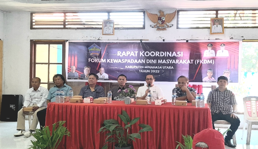 Minut – Forum Kewaspadaan Dini Masyarakat (FKDM) Kab. Minahasa Utara (Minut), Jumat, 26 September 2025 gelar rapat kordinasi bertempat di aula Kantor Camat Airmadidi Kecamatan Airmadidi yang dihadiri oleh Plh. Kepala Badan (KaBan) Kesatuan Bangsa dan Politik (Kesbangpol) Minut Cresto Palandi, Camat Airmadidi Rocky Tangkulung, Ketua FKDM Minut Roy Maramis dan pengurus Leo Kalempouw beserta anggota yang ada dari 10 Kecamatan se- Minut.